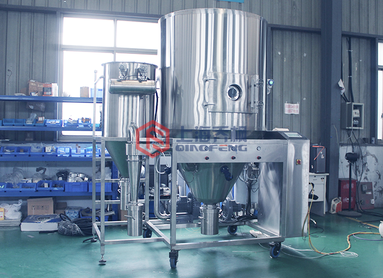 空氣經(jīng)過(guò)過(guò)濾和加熱器,進(jìn)入干燥室頂部空氣分配器,熱空氣呈螺旋狀均勻地進(jìn)入干燥室。料液經(jīng)塔體頂部的二流體霧化器或高速離心霧化器,(旋轉(zhuǎn))噴霧成極細(xì)微的霧狀液珠,與熱空氣并流接觸,在極短的時(shí)間內(nèi)可干燥為成品。成品連續(xù)地由干燥塔底部和旋風(fēng)分離器中輸出,廢氣由風(fēng)機(jī)排空。